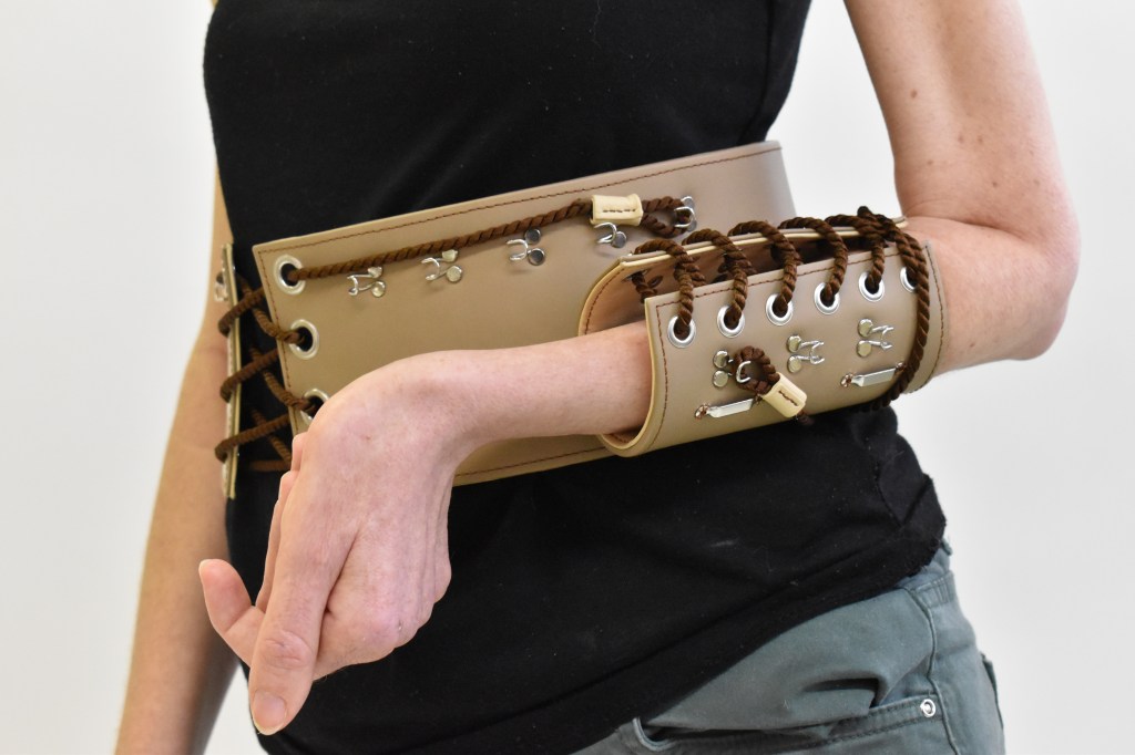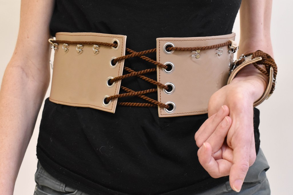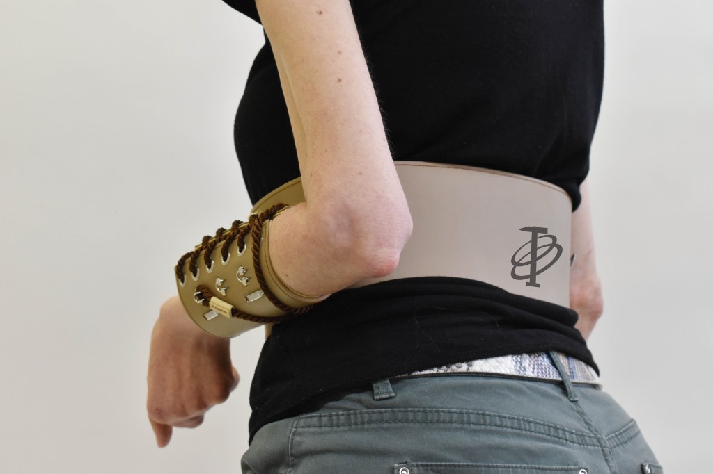 The Belt and Brace are meant to attach together in order to hold up the passive arm (unable to move) of the model (Madam Maud Leibundgut) around her waist area, in order for her to be able to use both her hands when needed for any task, which would be more convenient for her.